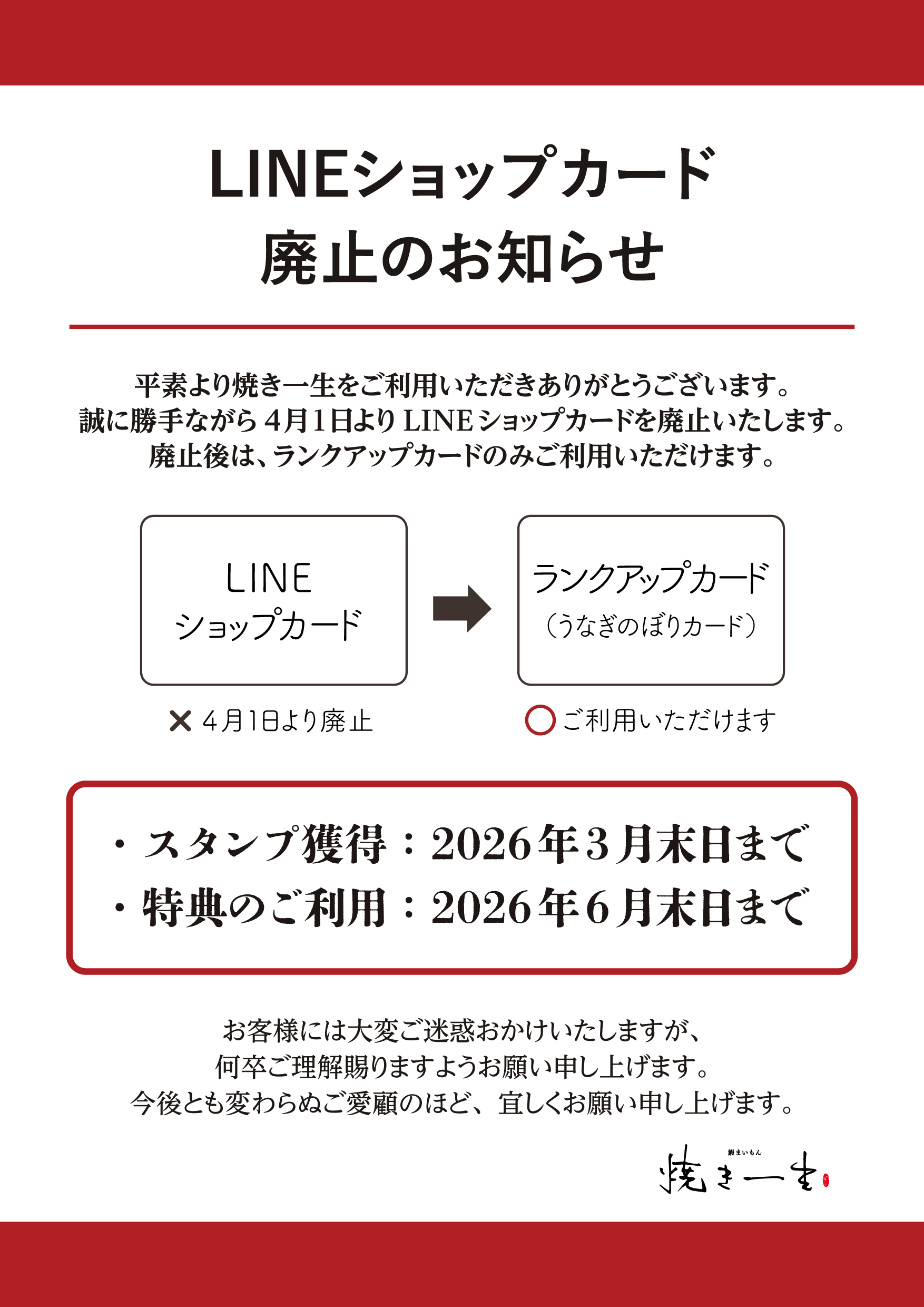 お知らせ トップお知らせLINEショップカード廃止のお知らせ 2026.02.13 お知らせ LINEショップカード廃止のお知らせ いつも当店をご利用いただき、誠にありがとうございます。 2026年3月31日をもちまして、LINEショップカードを終了いたします。尚、貯まった特典は、2026年6月末日までご利用いただけます。 2026年4月1日以降は、ランクアップカードのみのご利用となりますので、予めご了承ください。 今後とも変わらぬご愛顧の程、よろしくお願いいたします。 焼き一生 前の記事 一覧に戻る